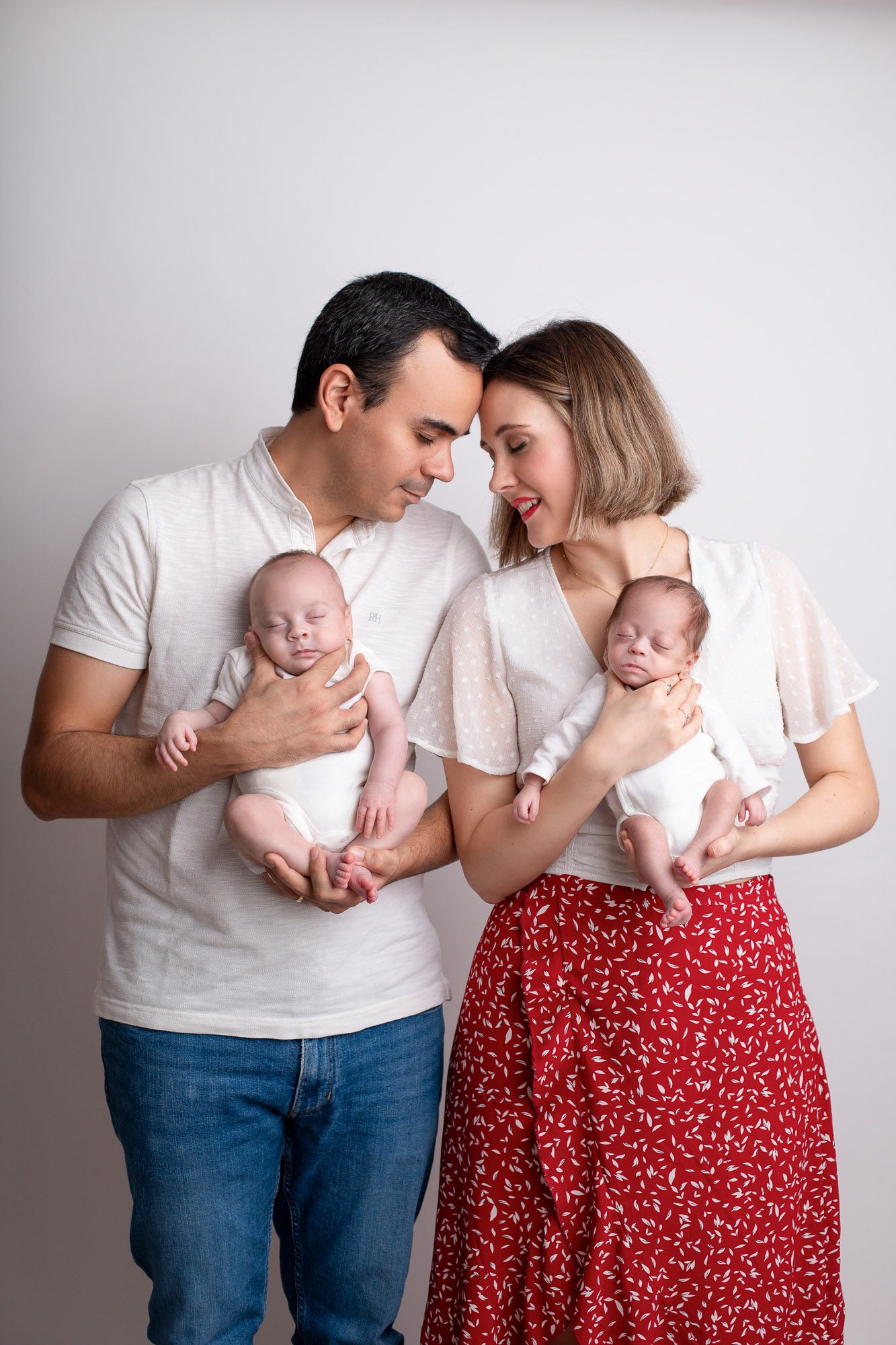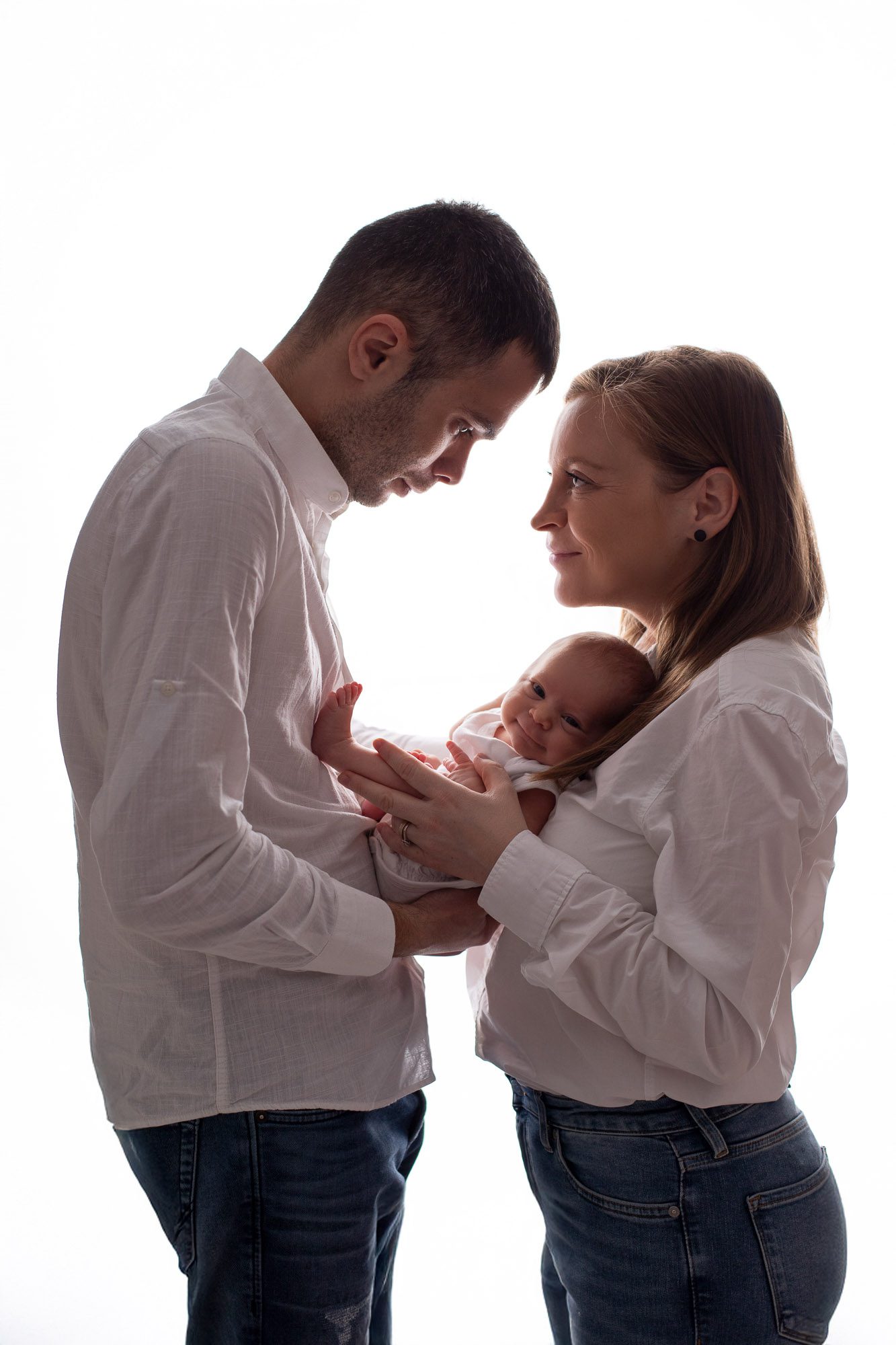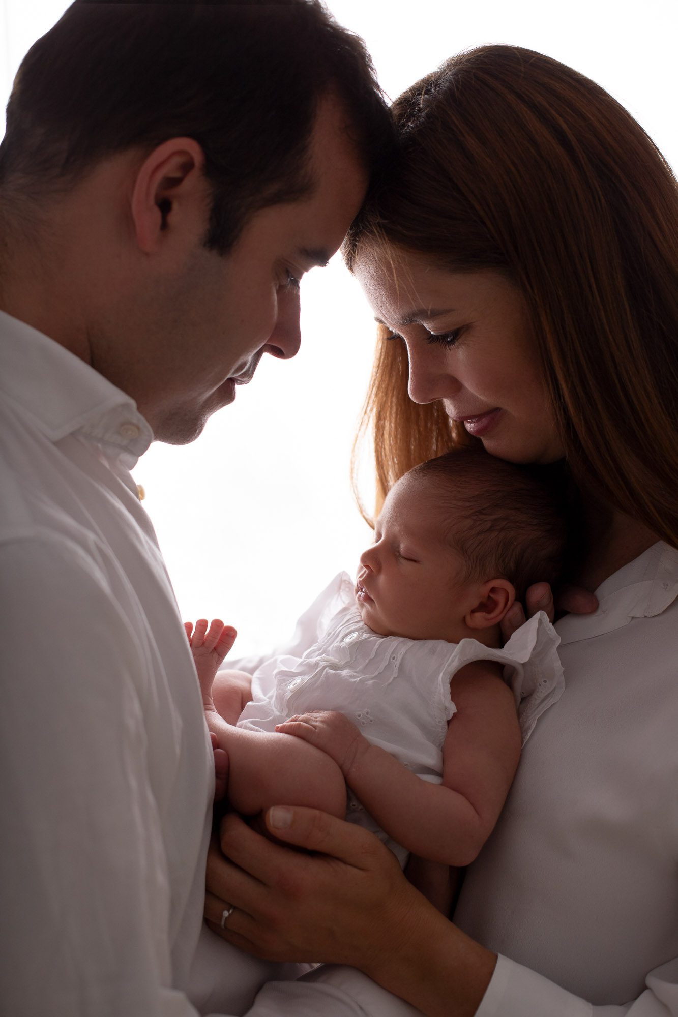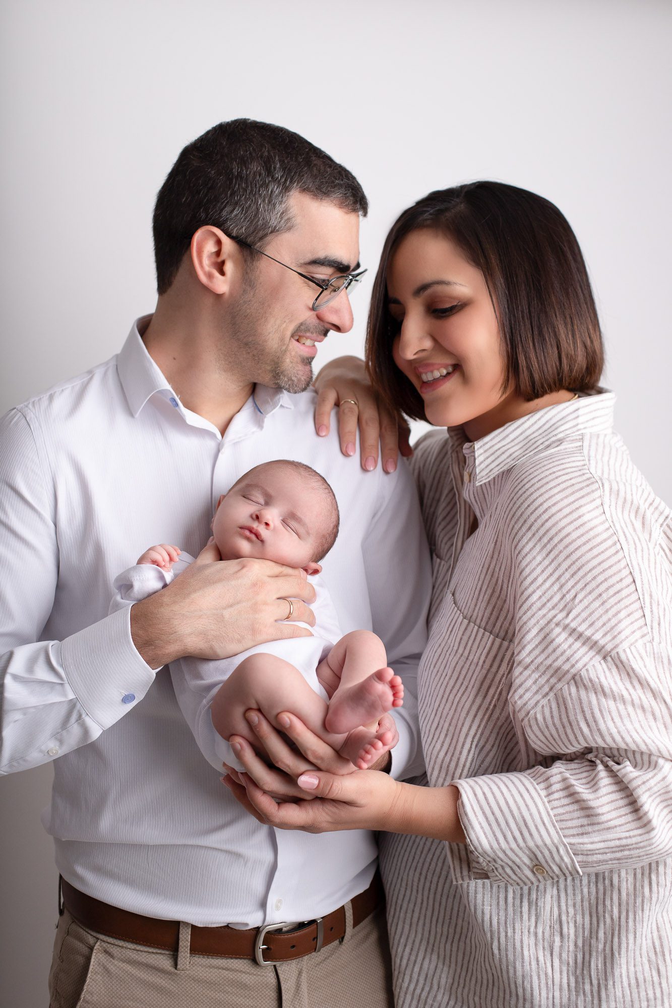 Solo trae un body blanco para tu bebé, ropa cómoda para las fotos familiares, pañales, chupete y biberón si no toma pecho. Todo lo demás lo tengo en el estudio.